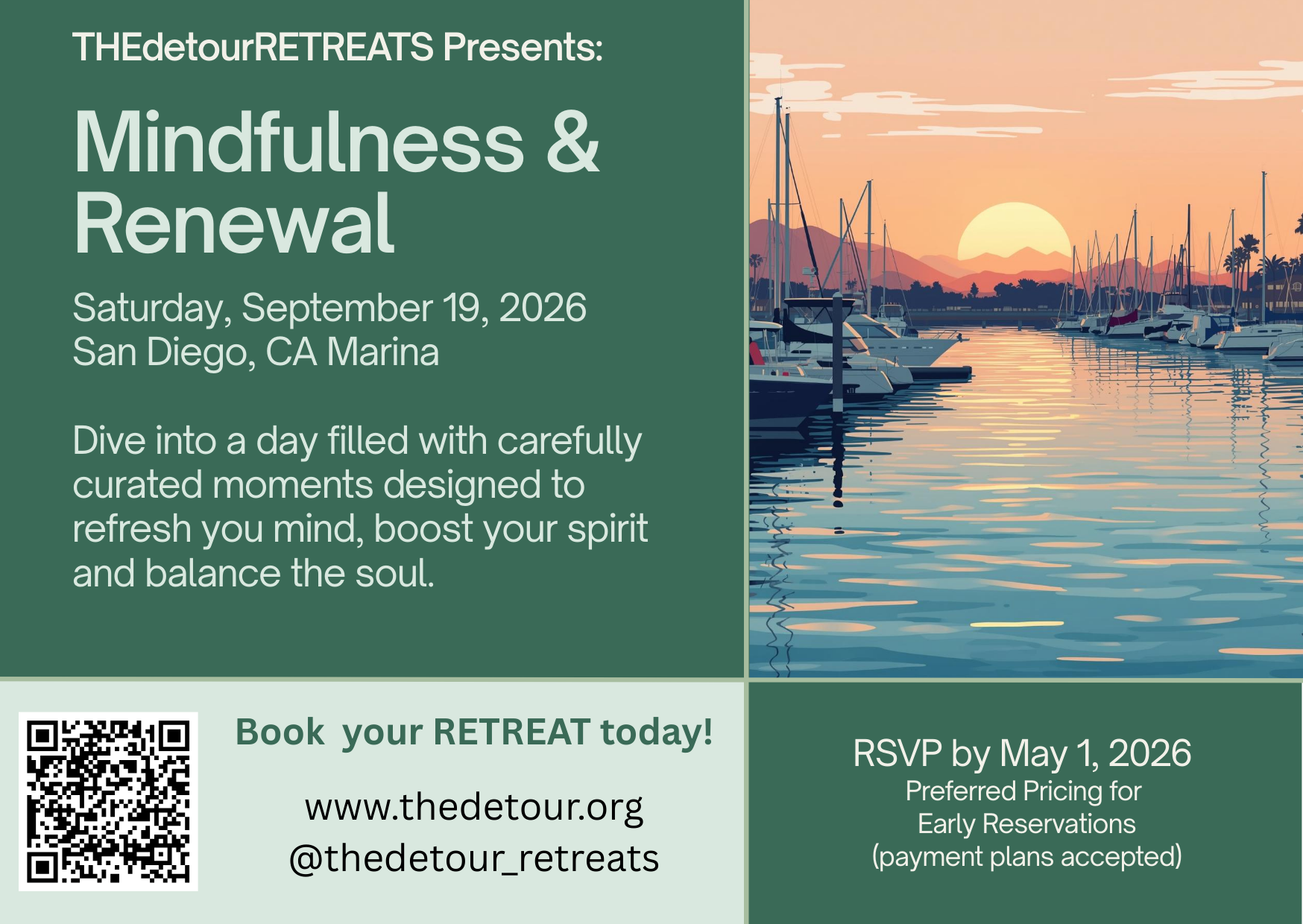 Join us for an awesome in-person experience by the marina! Dive into a day filled with relaxing activities, guided mindfulness sessions, and moments designed to refresh your mind and soul. Whether you're looking to unwind or recharge, this escape is all about finding your calm, connecting with others, and embracing renewal. Come ready to breathe, relax, and find your laughter.